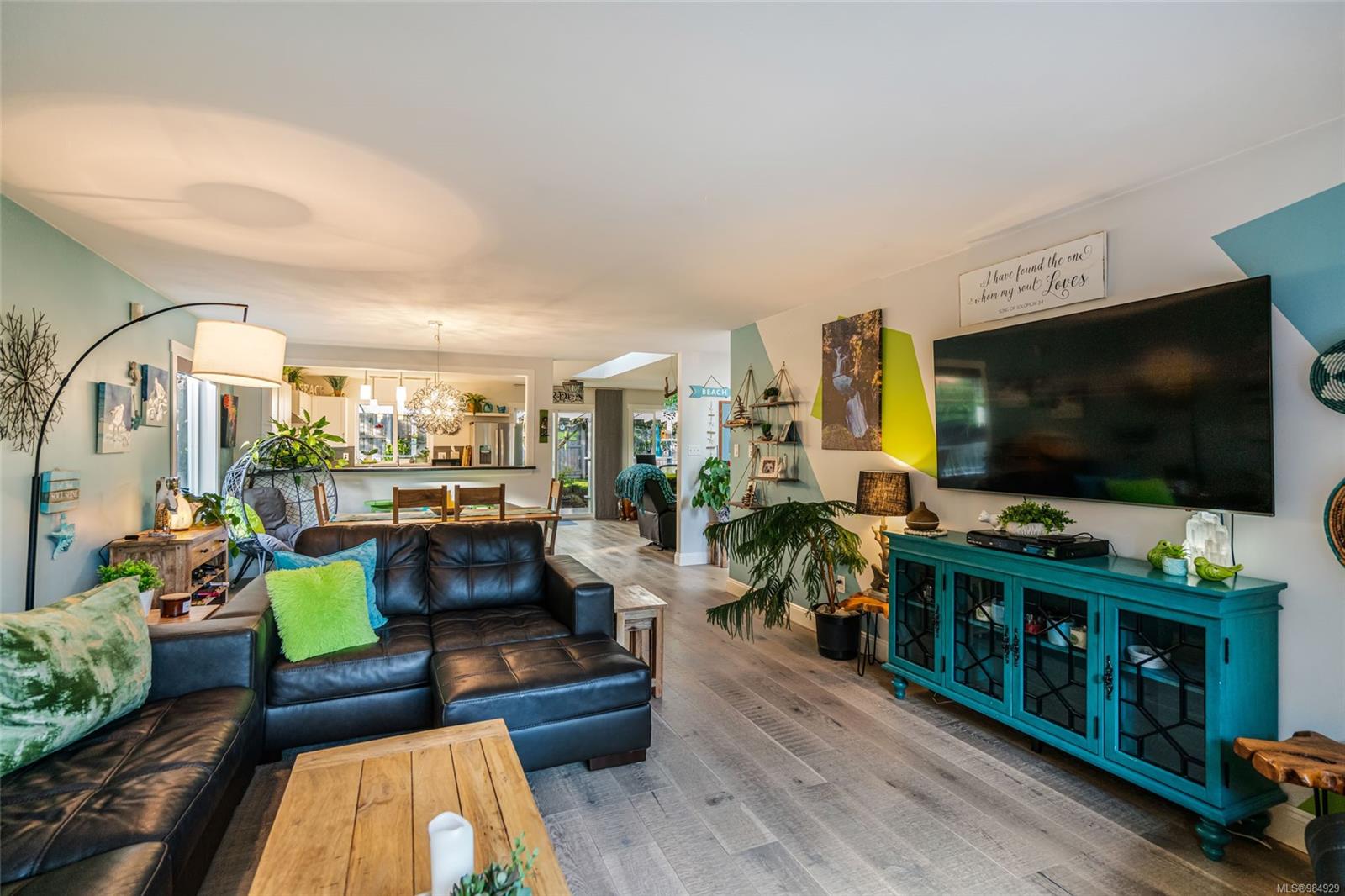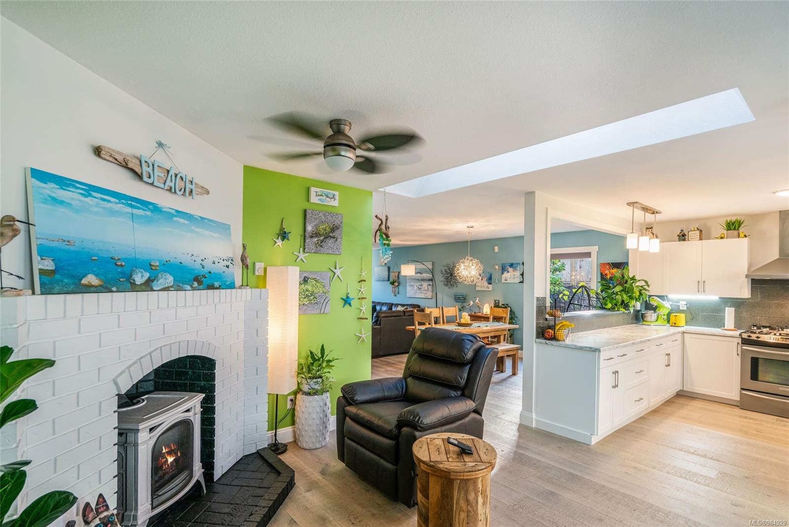 The open-concept design creates a seamless flow between the expansive kitchen, the spacious living and dining areas, and the cozy sitting nook complete with a newly installed gas fireplace. This thoughtfully designed layout is perfect for entertaining guests or simply enjoying intimate moments with loved ones. The kitchen, a true centerpiece of the home, is well-appointed with ample cabinetry, some modern appliances, and generous counter space, making it both functional and stylish.